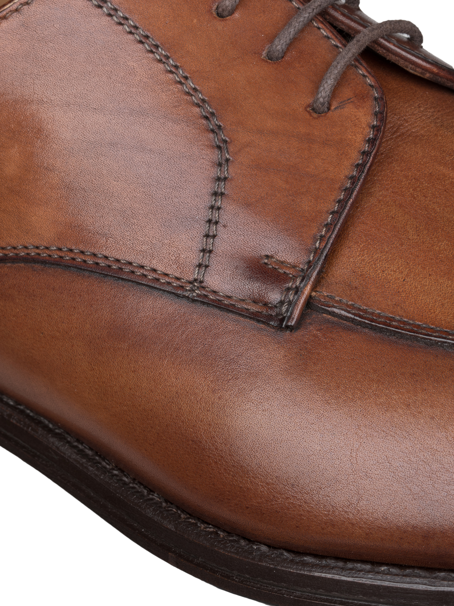 Дерби alqonquin из гладкой телячьей кожи имеют среднюю степень официальности и уместны как в повседневной работе в офисе, так и на неформальных деловых встречах. Отсутствие брогирования позволяет сочетать их как с брюками из тонкого сукна и вельвета, так и с чиносами или джинсами. Подкладка из воздухопроницаемой кожи даёт ногам комфорт, а подошва на низком наборном каблуке устойчивость.