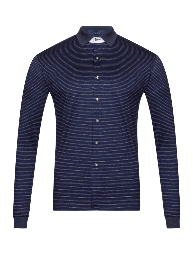 Создавая трикотажную рубашка из коллекции Schiatti, мастера бренда сделали ставку на исключительный комфорт. Крой выверенный многолетним опытом итальянских мастеров садиться точно по фигуре и приятно облегает тело, а материал изделия хлопок тонкой выделки обеспечивает отличную воздухопроницаемость и оптимальный микроклимат в течение всего дня. Дополнительной выразительности и индивидуальности образу добавляет принт полоска, а перламутровые пуговицы и акцентирование однотонного воротника контрастной стойкой, подчёркивает элегантность образа.